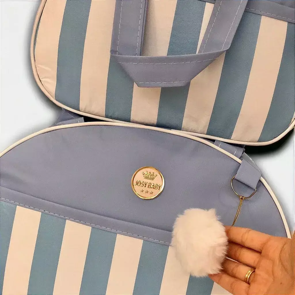 O Kit é composto por 02 bolsas nos tamanhos P e G, ambas possuem alça de mão, fechamento tipo mala com zíper, elas são revestidas internamente com material impermeável e de fácil limpeza. Esta incluso uma alça de ombro, permitindo maior facilidade em carregar as coisas na hora de sair com o bebê.