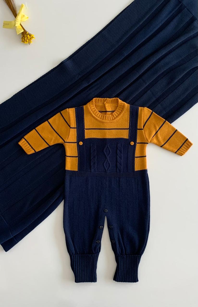 Saída Maternidade de Tricô Jardineira Mostarda com Marinho